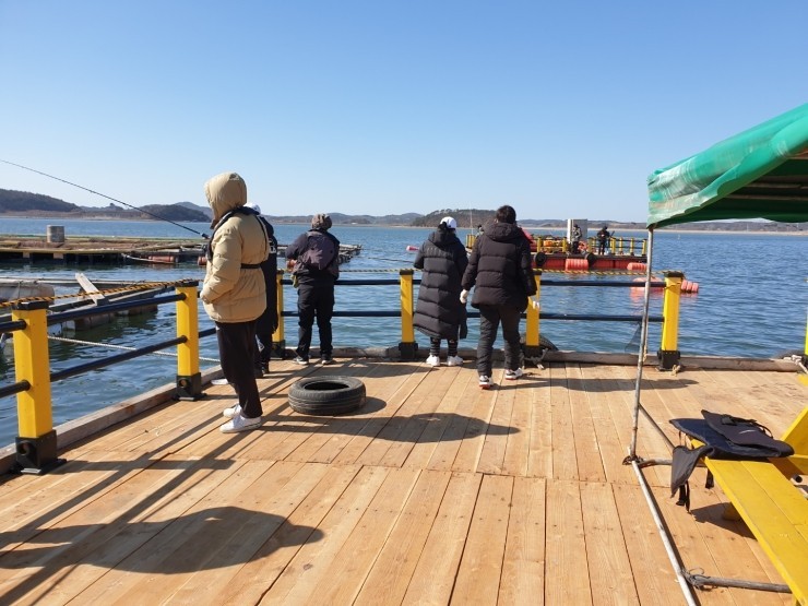 멀리 보이는 3번 좌대는 물이 가두리 쪽으로 흘러 그런가 가두리 바라보고 하시는 분들 간간이 올리는 게 보임